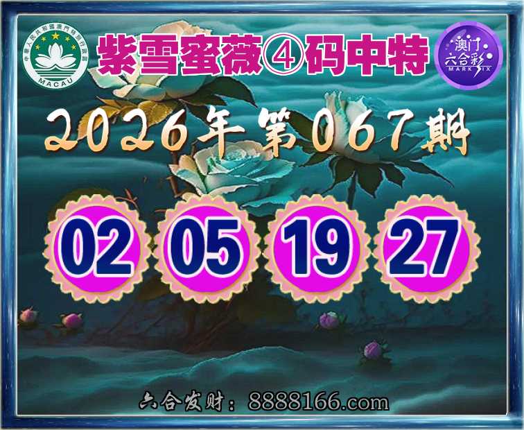 067期:【紫雪蜜薇】 🧧④码中特🧧【02.05.19.27】开:05