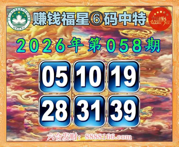 058期:【赚钱福星】 🚵♀️⑥码中特🚵♀️【05.10.19.28.31.39】开:31准