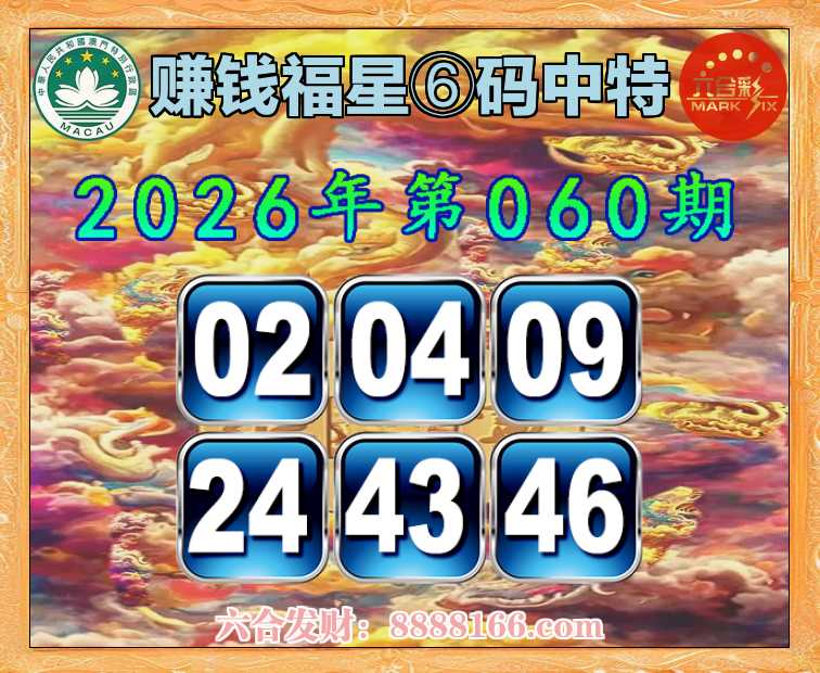 060期:【赚钱福星】 🚵♀️⑥码中特🚵♀️【02.04.09.24.43.46】开:09准