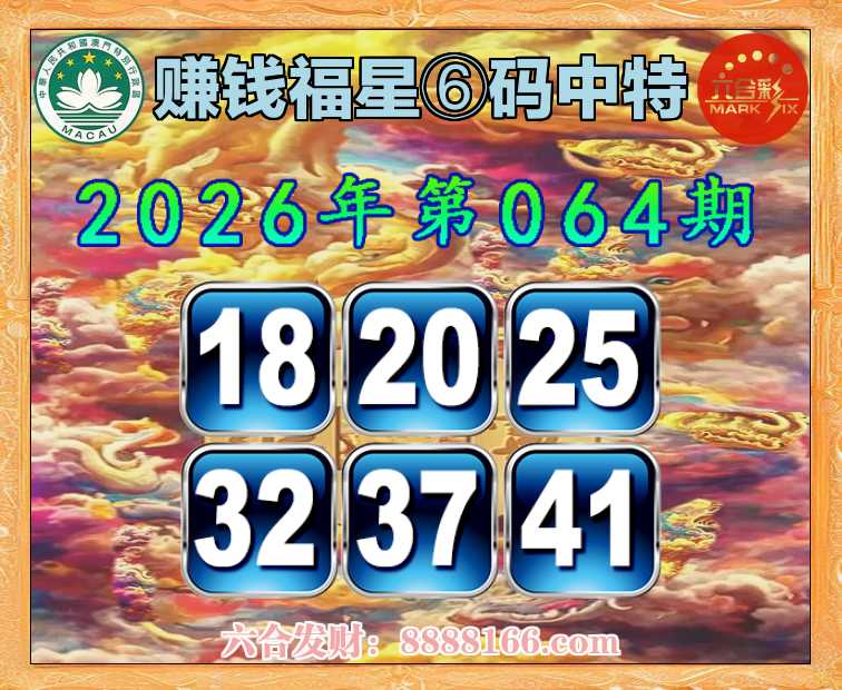 064期:【赚钱福星】 🚵♀️⑥码中特🚵♀️【18.20.25.32.37.41】开:18准