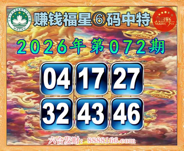 072期:【赚钱福星】 🚵♀️⑥码中特🚵♀️【04.17.27.32.43.46】开:46准
