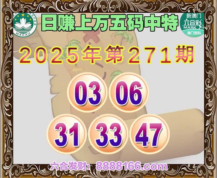 271期:《日赚上万》 🥽五码中特🥽【03.06.31.33.47】开:06准
