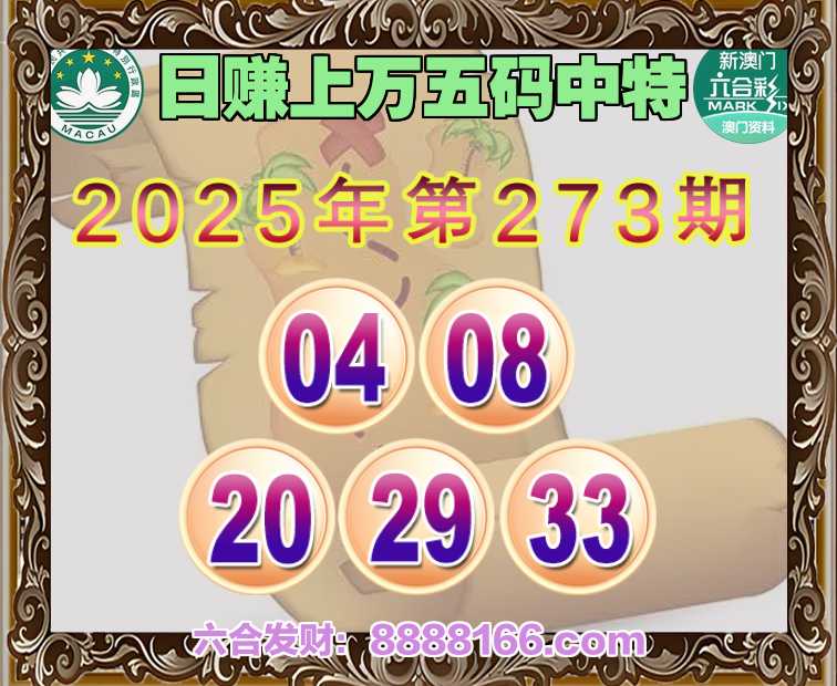 273期:《日赚上万》 🥽五码中特🥽【04.08.20.29.33】开:04准
