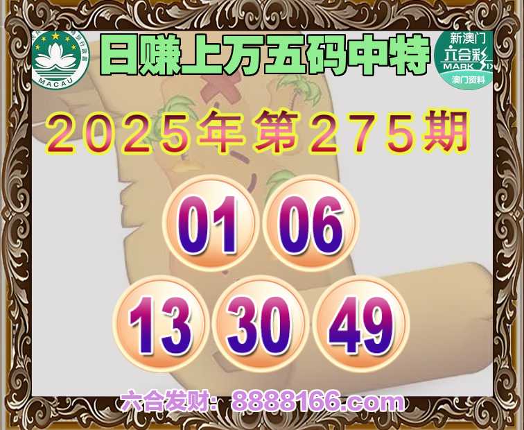 275期:《日赚上万》 🥽五码中特🥽【01.06.13.30.49】开:00准