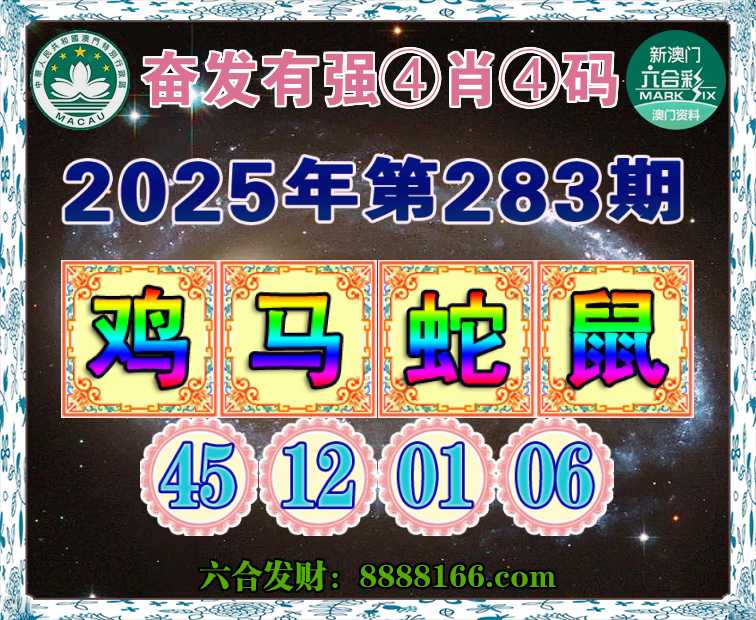 283期:《奋发有强》 🍎④肖④码🍎【鸡马蛇鼠】【45.12.01.06】开:鸡45准