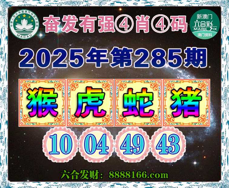 285期:《奋发有强》 🍎④肖④码🍎【猴虎蛇猪】【10.04.49.43】开:马24错