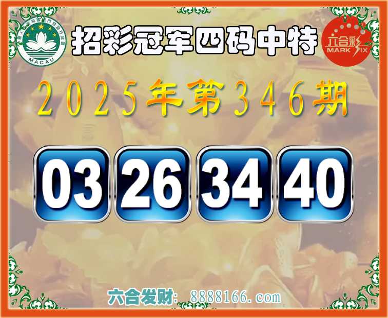 346期:《招彩冠军》 🤩四码中特🤩【03.26.34.40】开:03准