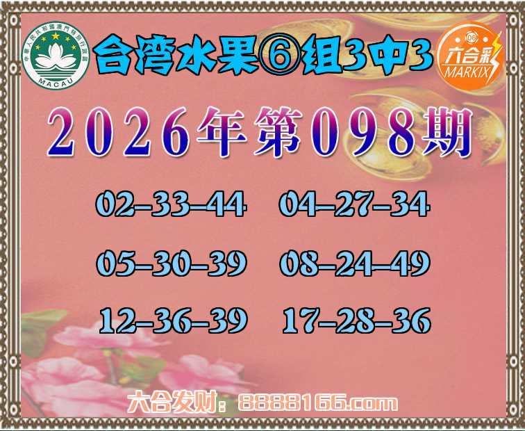 098期:【台湾水果】 🥓⑥组3中3🥓