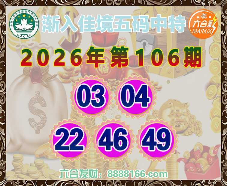 106期: 渐入佳境  ♣️五码中特 ♣️【03.04.22.46.49】开:22