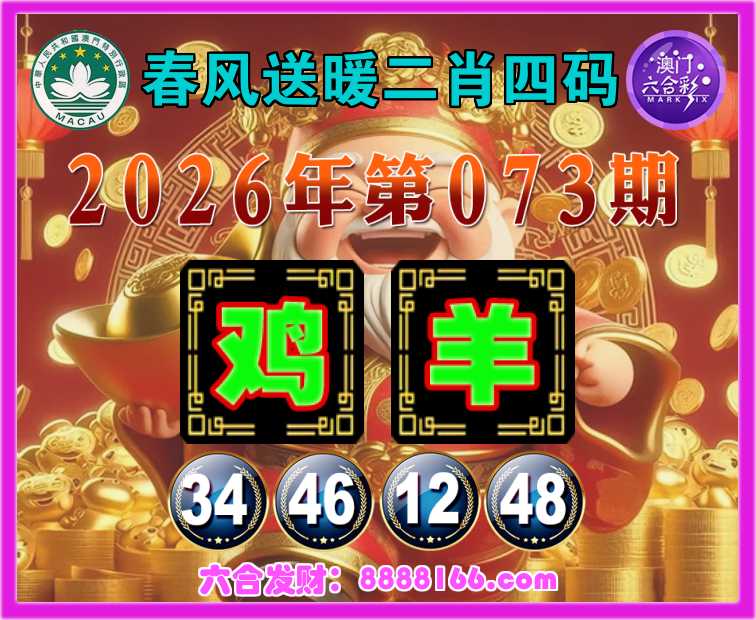 073期: 🎉《春风送暖》 🎉二肖四码🎉【鸡羊】【34.46.12.48】开:鸡34准